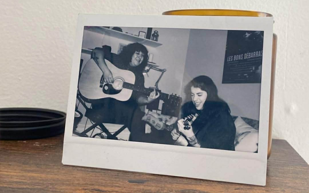Sarah (basse): La seule photo que je possède de manière physique c’est celle-là. Raph et moi qui jouons des covers sur la guitare à 3 heures du matin dans un party du jour de l’an pré pandémique….